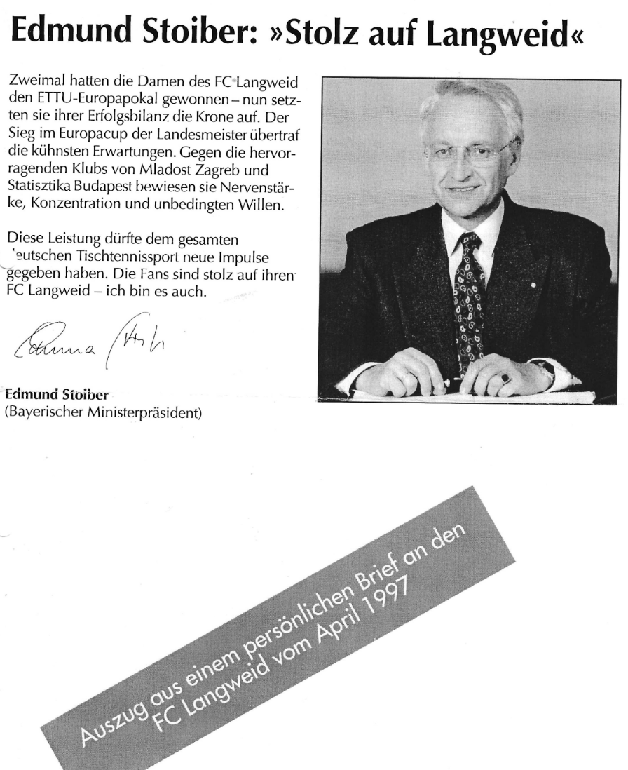 Die Verantwortlichen des TTC Langweid nahmen am Samstag nach dem Spiel gegen Uentrop die Gelegenheit wahr, mit den treuen Zuschauer*innen auf eine erfolgreiche Saison zurückzublicken und „anzustoßen“. Insider erinnerten sich an 1996/97 als 4 hochrangige Pokale im Vereinspokalschrank Platz gefunden hatten: Der Pokal als ETTU Pokalmeister, der für den Championsleaguesieg, für die Titel des Deutschen Meisters, jeweils des 1. Damenteams und schließlich der Pokal als Deutscher Meister der Jugend. Alfons Biller, der 1. Vorsitzende des TTC, sprach dennoch berechtigt von der aufgrund von Meistertiteln breiter Ebene erfolgreichsten Saison, denn sie wurden von 4 Mannschaften errungen: Die Erfolge zeugen für kontinuierliche Arbeit des Vereins über viele Jahre hinweg. Ein Ausruhen nach glorreichen Jahren auf den Erfolgen gab es nicht. Die Jugendarbeit war entscheidend für die derzeitige Erfolgswelle im Männerbereich und für den guten Unterbau im Damentischtennis. Als Beispiel dafür wurde der Gewinn der Meisterschaft durch das 3. Damenteam in der Bezirksoberliga und deren Titelgewinn bei der bayerischen Pokalmeisterschaft verbunden mit der Qualifikation für die deutsche Pokalmeisterschaft vom 9.-12.5. in Schleswig-Holstein angeführt. Markus Wirth, der 2. Vorsitzende, wies auf besondere Spielbilanzen von Spielerinnen der Dritten hin: Barbara Jungbauer 21:0, plus 10:0 in Pokalspielen, Romy Steffen 12:2 (hat nur in der Vorrunde in Damen III spielen können), Lisa Vögele 14:2 Sandra Maiershofer 7:0, Cornelia Brummer 30:6, Vivien Behnisch 12:3, Anna Kaps 9:5.